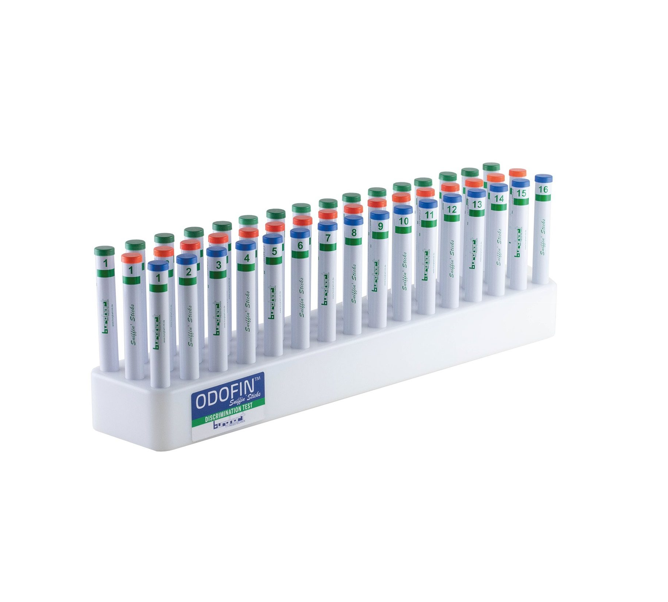 ODOFIN 嗅觉棒辨别测试用于检测气味辨别能力。测试包含 3 x 16 = 48 根嗅觉棒。受试者需要区分气味大致相同的几种气味。每次测试会提供三根嗅觉棒:两根气味相同,一根气味不同。受试者必须找出哪根气味不同。此测试共包含 16 种不同的气味(即 16 x 3 = 48 根嗅觉棒)。