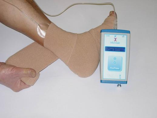 • 该款仪器采用由超薄的生物相容性材料制成的圆形的压力传感器,并在其中注入已知量的空气。传感器放置在肢体和绷带之间。