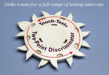 Complete, two-point discrimination testing in one economical unit. This innovative design consists of two rotating, plastic disks that are joined together. Tests static and moving two-point discrimination of fingers, toes, or sensory flaps. Ideal for testing following nerve repair, grafts and innervated tissue transfer for desensitization, or to determine level of impairment. Rounded tips are spaced at standard testing intervals from 1mm to 15mm apart. A 20mm and 25mm spacing also are given. One disk setting tests from 1mm to 8mm, and the other setting tests from 9mm to 15mm. To change settings, just rotate the top disk until it clicks in place. Easy to read and use. Ideal for the home care therapist and for patient home use. Instructions are included. Patent pending. NC12776 Touch-Test Two-Point Discriminator Email for quotation